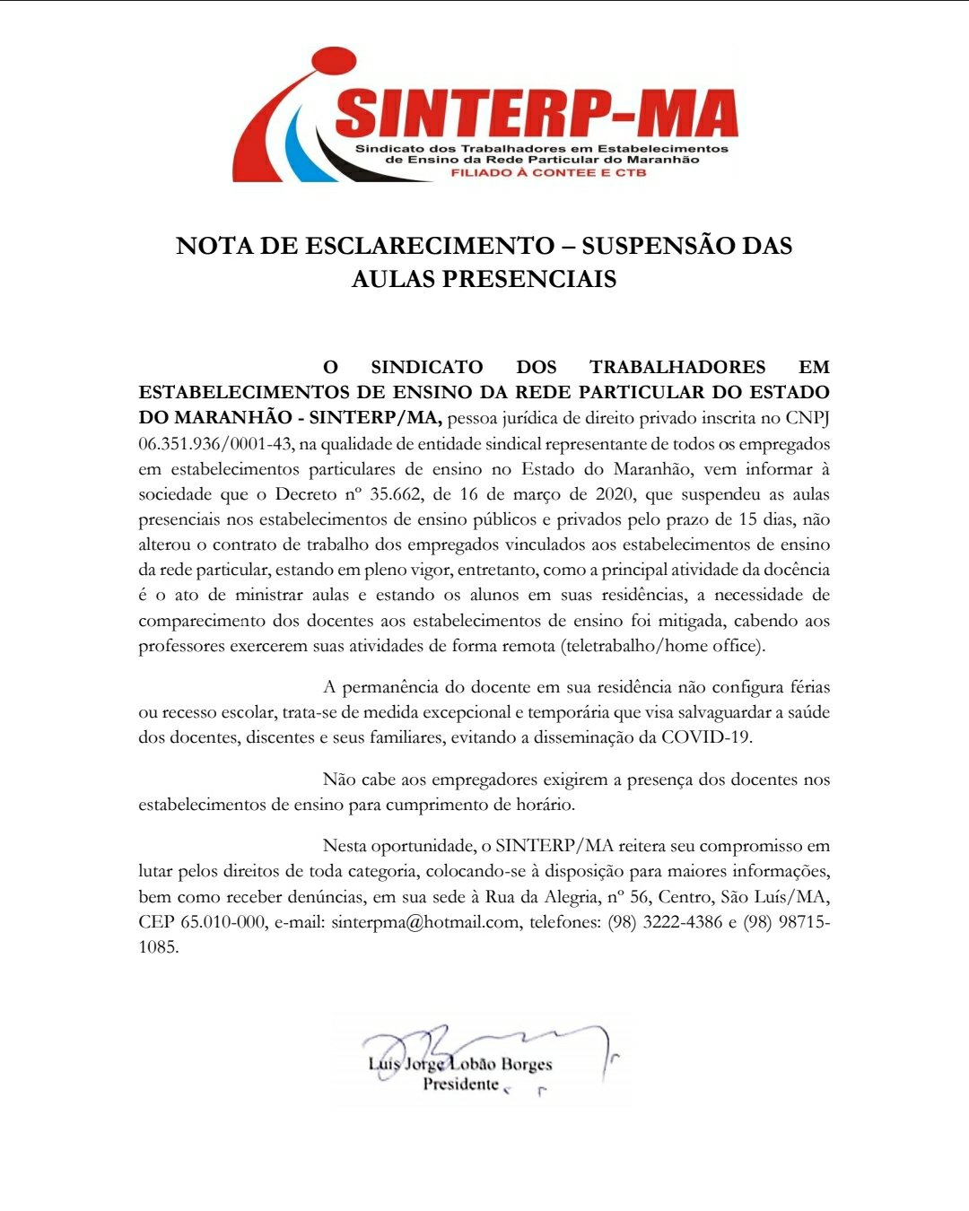 Nota de esclarecimento – Suspensão das aulas presenciais